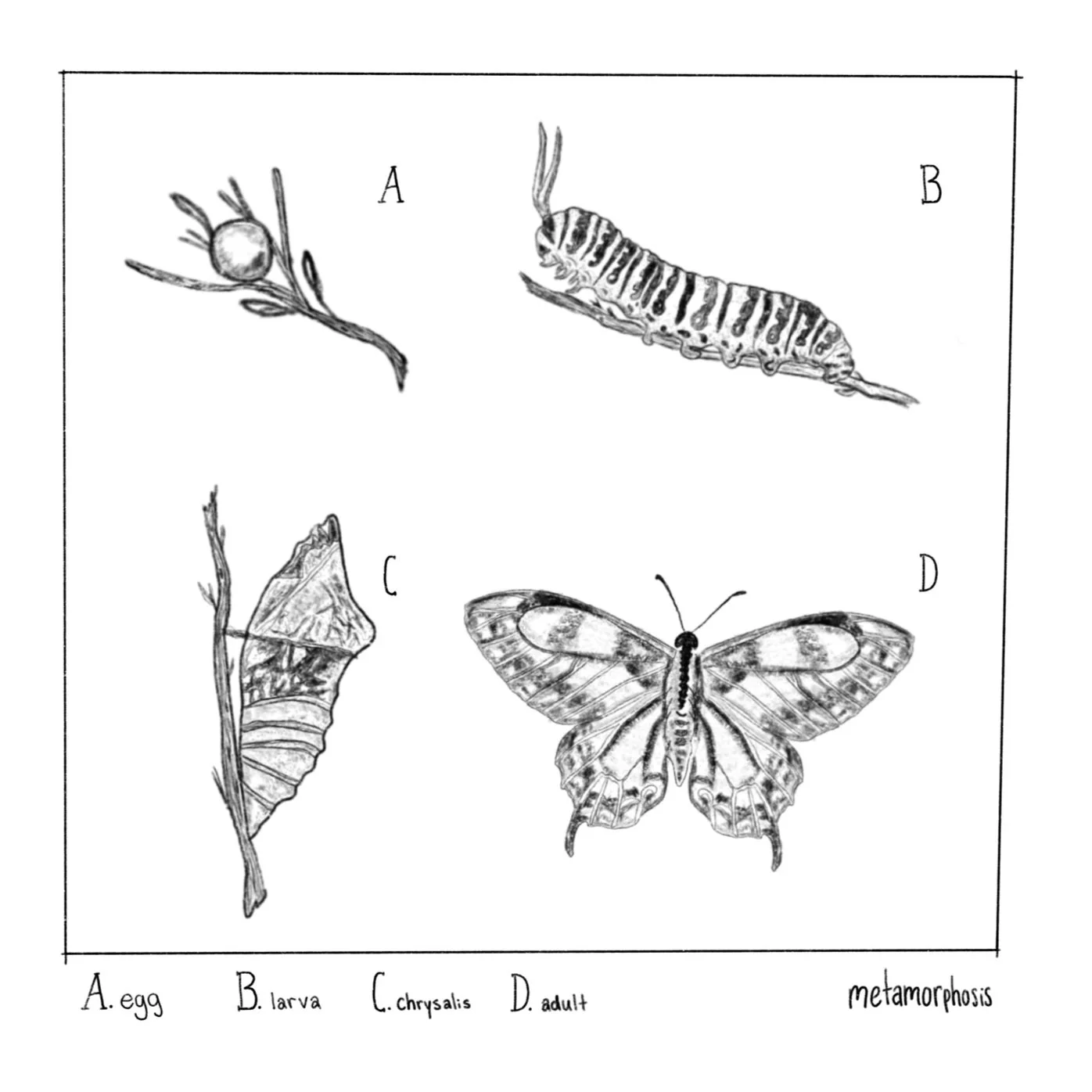 Transformation: The piece itself depicts the process of transformation, lending itself to be adapted based on the user’s needs. Each stage is represented, beginning with the egg, larva, chrysalis, and adult wing movement as an abstract form connecting each piece with a cohesive visual language.
